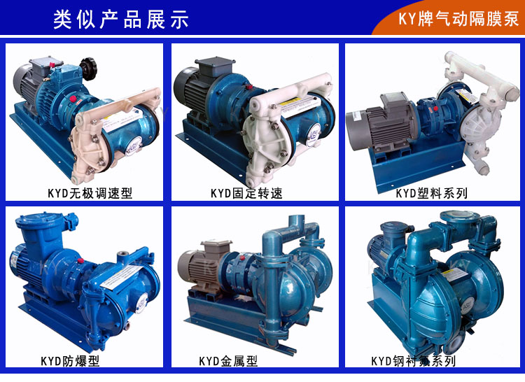 ![]() | KYD隔膜泵電動系列產品不需灌引水,自吸能力達5米以上。KYD隔膜泵電動系列產品通過性能好,直徑在10毫米以下的顆粒、泥漿等均可以毫不費力地通過。 | |