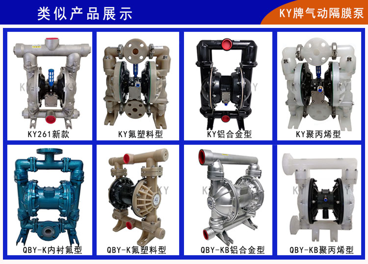 上海楷陽為方便客戶使用,第四代氣動(dòng)隔膜泵和KY牌增強(qiáng)型氣動(dòng)隔膜泵已經(jīng)研發(fā)了十余種材質(zhì)生產(chǎn):鑄鋼氣動(dòng)隔膜泵、鋁合金氣動(dòng)隔膜泵、不銹鋼304氣動(dòng)隔膜泵、不銹鋼316L氣動(dòng)隔膜泵、工程塑料(增強(qiáng)聚丙烯)氣動(dòng)隔膜泵、氟塑料(PVDF)氣動(dòng)隔膜泵和耐腐蝕抗壓性能超強(qiáng)的鋼襯氟氣動(dòng)隔膜泵等。