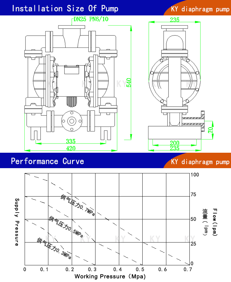 8、氣動(dòng)隔膜水泵通過(guò)性能好,允許通過(guò)最大顆粒直徑達(dá)10毫米。