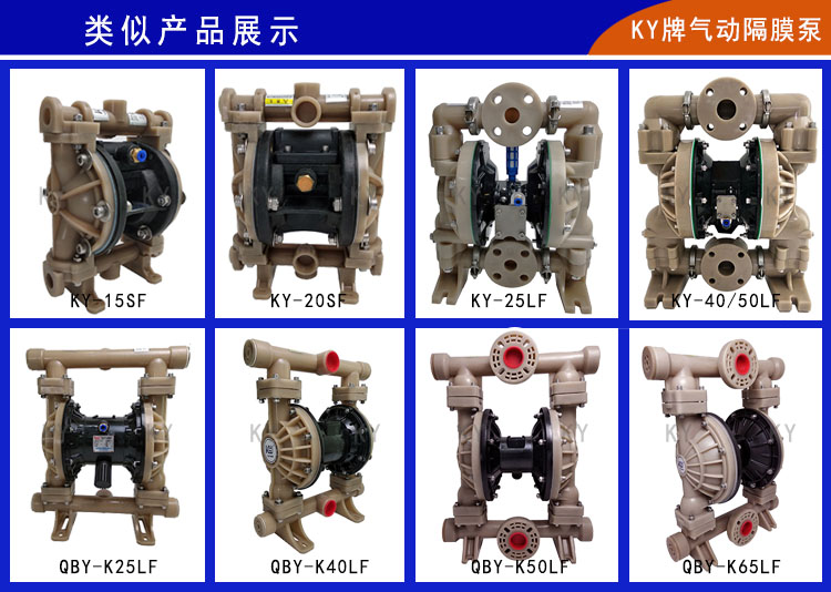 氟塑料氣動隔膜泵的過流部分泵體選用優質聚偏氟乙烯材料,所以市場上也叫PVDF氣動隔膜泵或者全氟氣動隔膜泵。PVDF的化學穩定性良好,具有優良的耐化學腐蝕性和良好的耐熱穩定性,是一些化工行業、生物制藥行業、污水藥劑生產等行業的首選隔膜泵材質。KY牌氟塑料氣動隔膜泵是一種以氣源為動力的容積泵,經過數年的研究發展,上海楷陽生產的最新一代增強型氣動隔膜泵具有超越四代,替代進口的獨特優點: