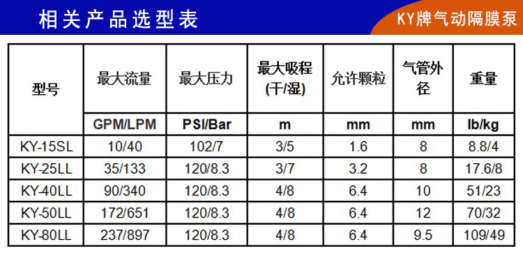 1)、KY-80LL大流量鋁合金氣動隔膜泵,配齊裝置進一步革新,中間體和隔排為一體式;助動軸和助動滑塊也改為一體式生產,大大提高了空氣利用效率,避免了因氣壓不穩定而產生的死機、停機;真正做到了無死機,和自動化機械設備做到無縫連接。