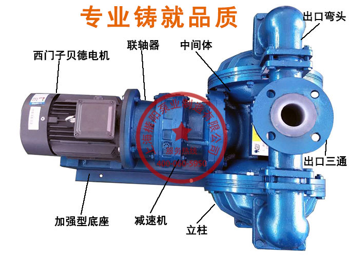 氣動隔膜泵雖然氣動馬達配件比較多,但是相對重量比較輕、體積比較小所以價值也相對比較低;電動隔膜泵雖然只有四大部分組成,但是其中間體相對較重,因為它要有 足夠的物理性能支持電機和泵體的運轉。減速機改用擺針式,雖然重量比渦輪式輕很多,但是價格要比電機還要貴很多。三項異步電機是決定電動隔膜泵質量和品質的重要因素,很多隔膜泵廠家為節省成本,配備一些雜牌電機,用以隔膜泵銷售的惡意拼價格。上海楷陽泵業只比質量,不比價格;在原有DBY電動隔膜泵的基礎上不僅加配了聯軸器,而且標配西門子貝德電機。楷陽KYD型電動隔膜泵性能參數更優越,運行更平穩,是真正的高品質電動隔膜泵。